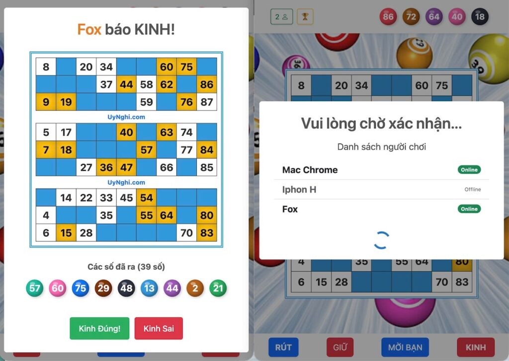 Khi bạn đã đủ số theo hàng ngang (hoặc quy định riêng của nhóm), hãy nhấn nút “KINH” ở góc trên bên phải để báo hiệu mình đã thắng.